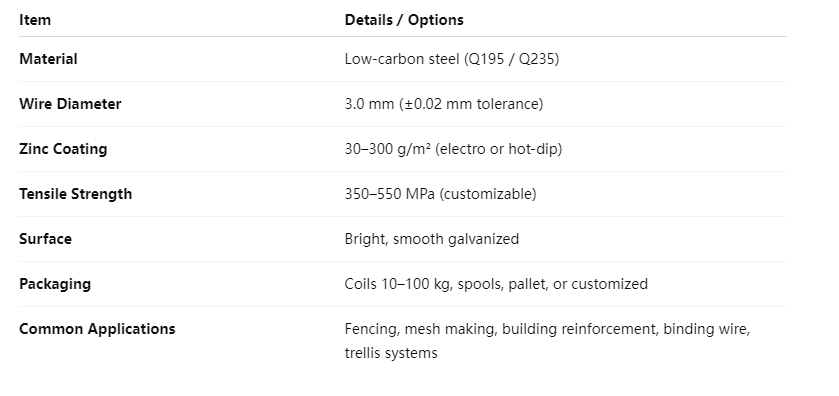 3 mm steel wire galvanized iron wire is a highly versatile material widely used in construction, agriculture, manufacturing, and various industrial applications. It is produced from high-quality low-carbon steel wire, then fully coated through either hot-dip galvanizing or electro-galvanizing. The zinc layer acts as a protective shield, preventing oxidation and rust even under long-term outdoor exposure.