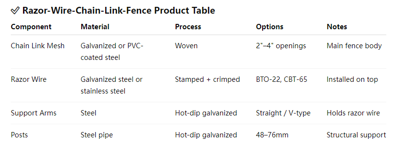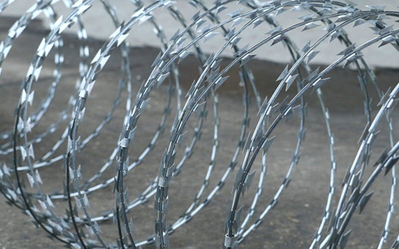 At the top, razor wire—either in straight-line strands or concertina coils—is mounted on extension arms. Each coil or blade strip is formed by stamping razor-sharp barbs from steel sheet and securing them onto a high-tensile core wire. The combination of a strong mesh foundation and razor-edge protection provides both physical strength and psychological deterrence.